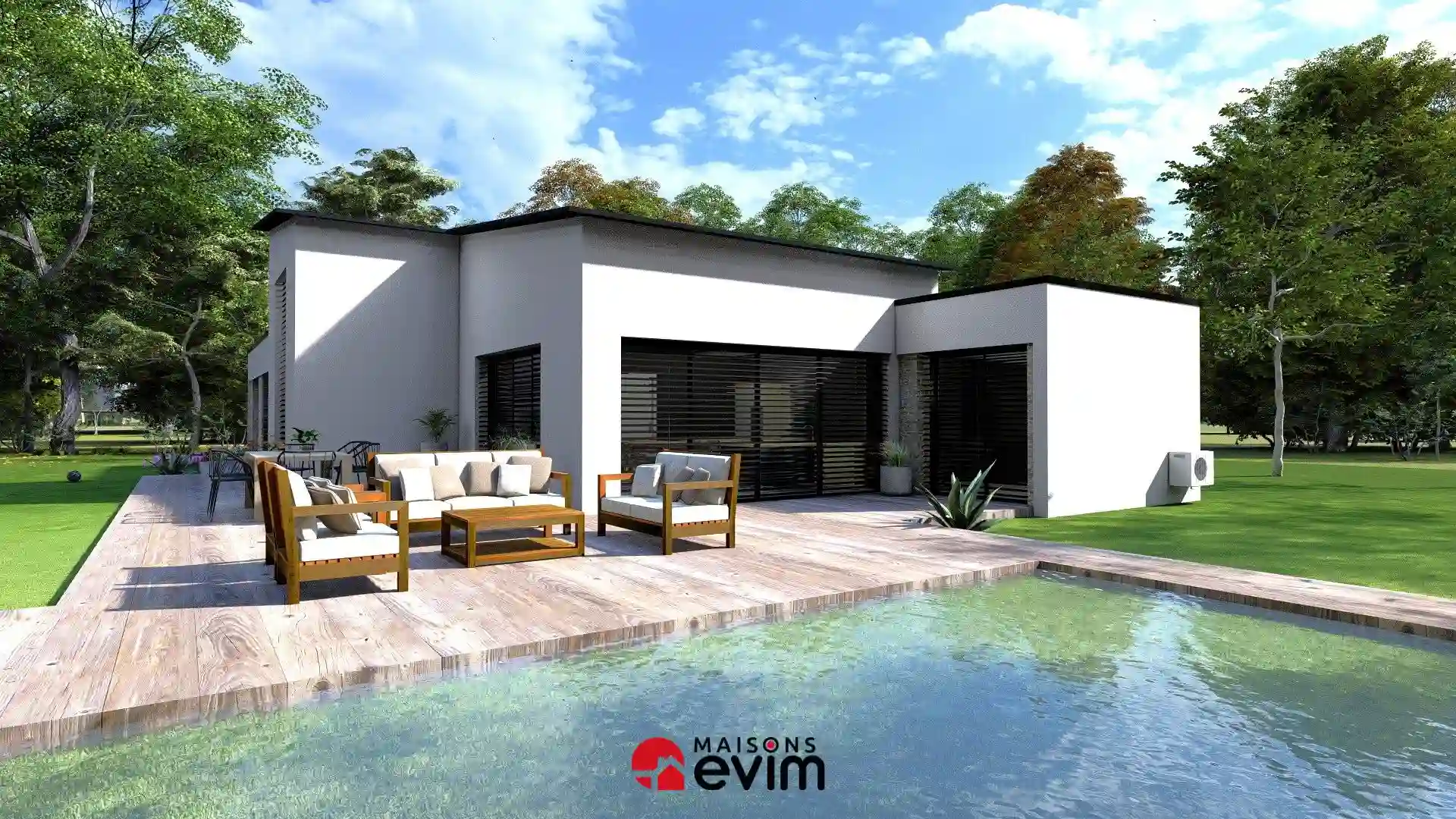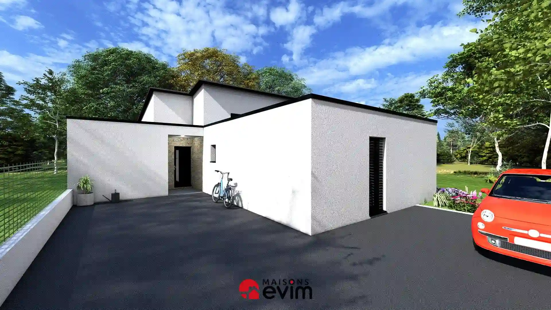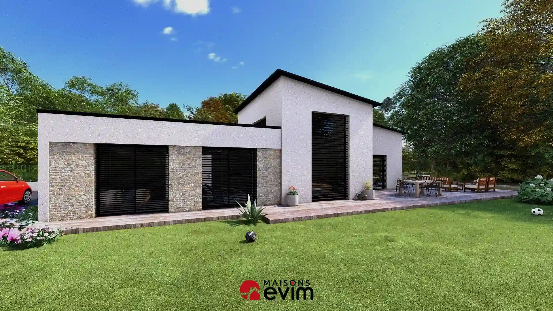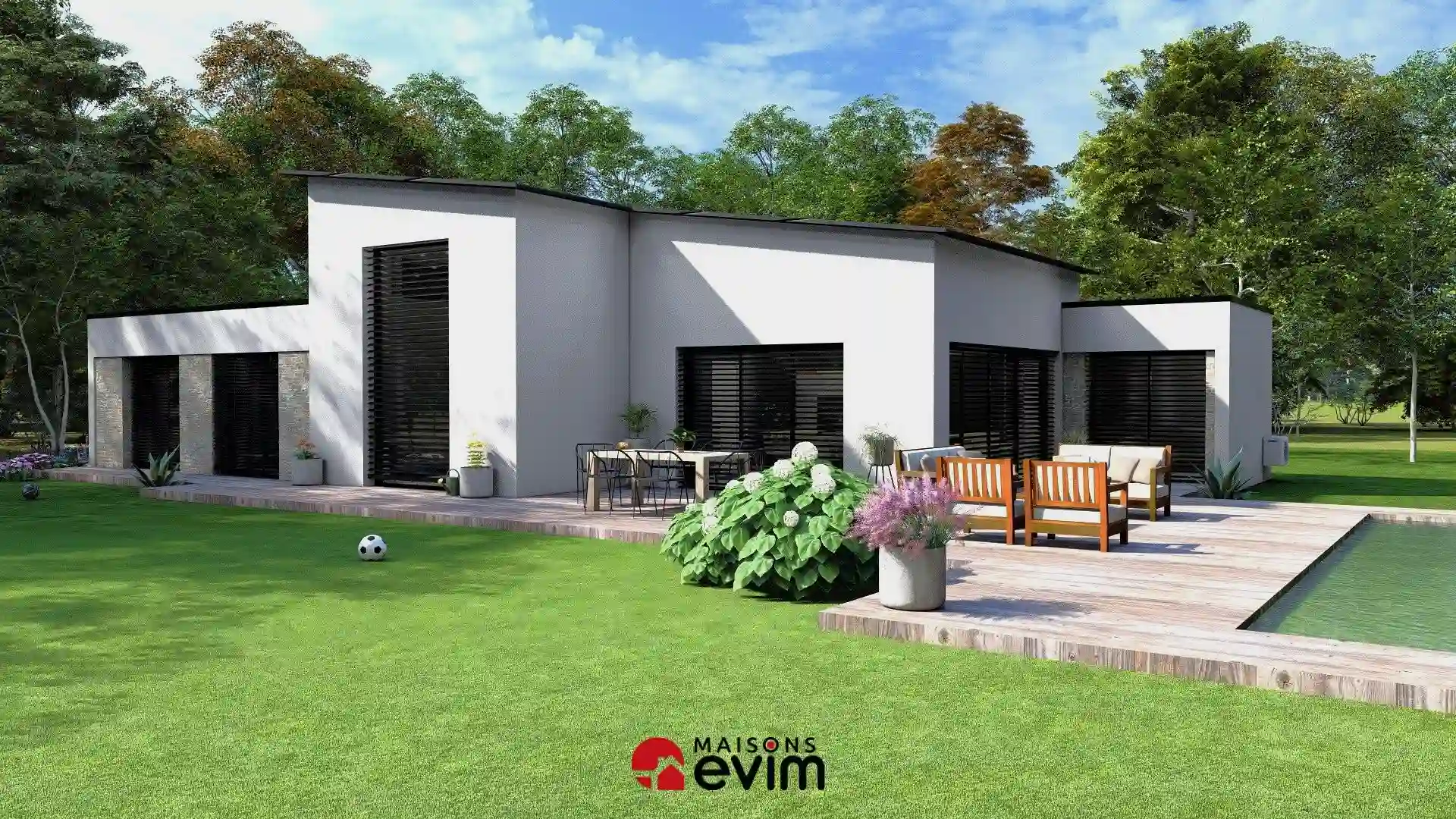 Maison de plain-pied de 134,65 m² à toiture mono-pente, 3 chambres et prestations premium pour un confort durable.