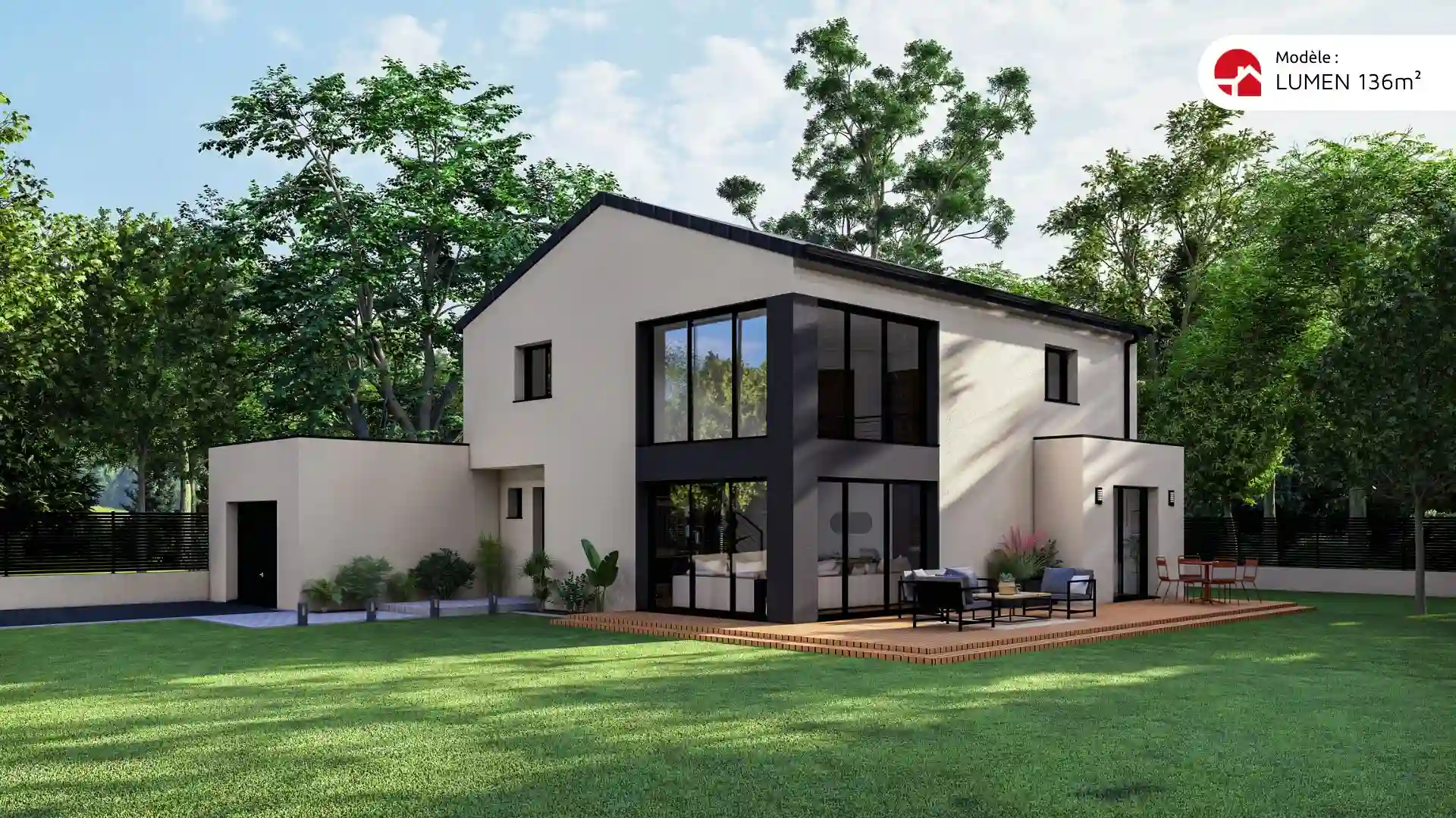 Gamme Horizon Maison lumen 136 m² Norme RT2020 Maison comprenant une cuisine ouverte sur un salon/séjour, 2 chambres, une salle de bain, wc. à partir de 280 000€.
